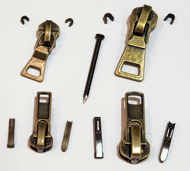 Kit Réparation Zip 5 et 8 Double Curseurs Bouche à Bouche Vieux Laiton , curseur , boitier , manchon et arrêt